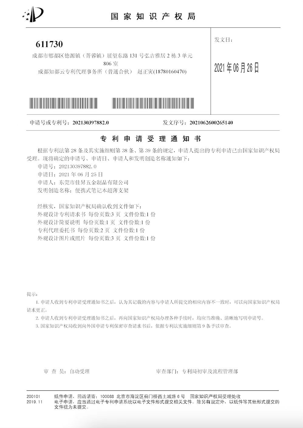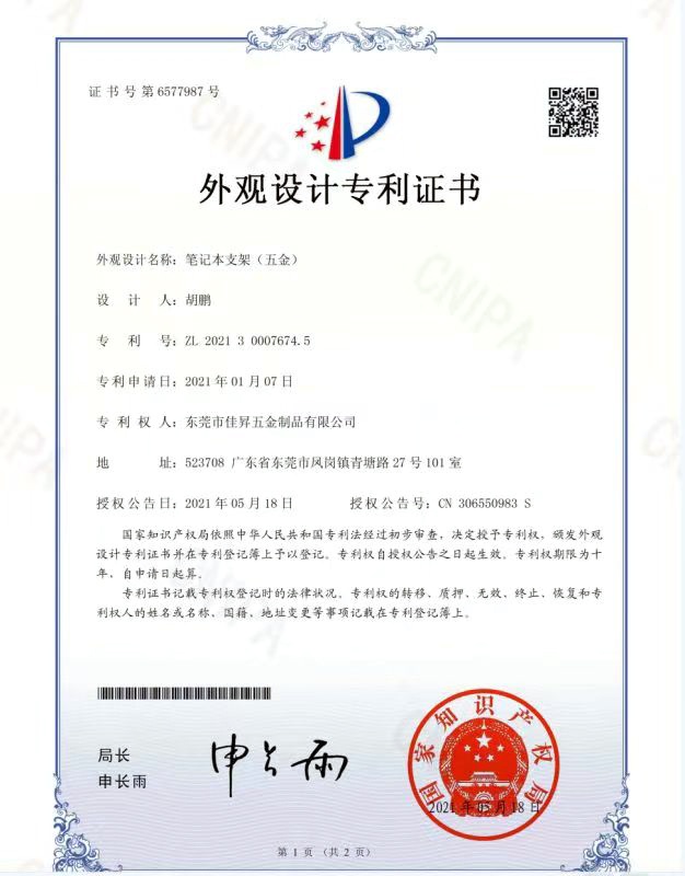 ◆ 專利權: 擁有8項由國家知識產權局頒發(fā)的外觀設計專利證書
